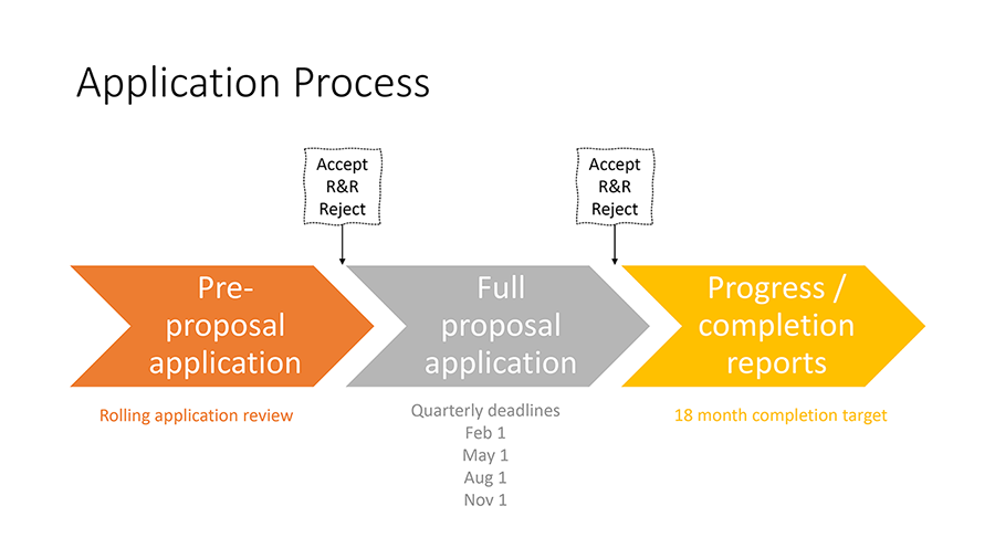 4. Submission of full proposal*: Those who have received notification of approved pre-proposals will be invited to proceed to a full grant application. Requirements for application are outlined in link below. There are four full grant application deadlines per calendar year: February 1, May 1, August 1, and November 1.